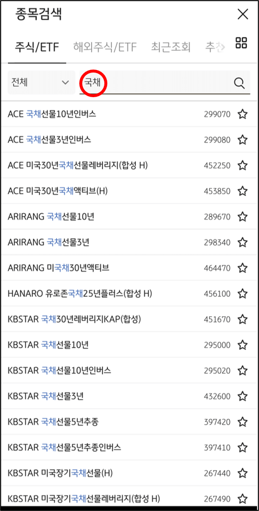 9. 돋보기 아이콘 옆을 터치하여 "채권" 또는 "국채"라고 검색합니다. 그러면 주식시장에 상장되어있는 국채 ETF 상품을 확인하실 수 있으며, 원하는 상품을 선택하시어 주식 거래하듯 거래하시면 됩니다.