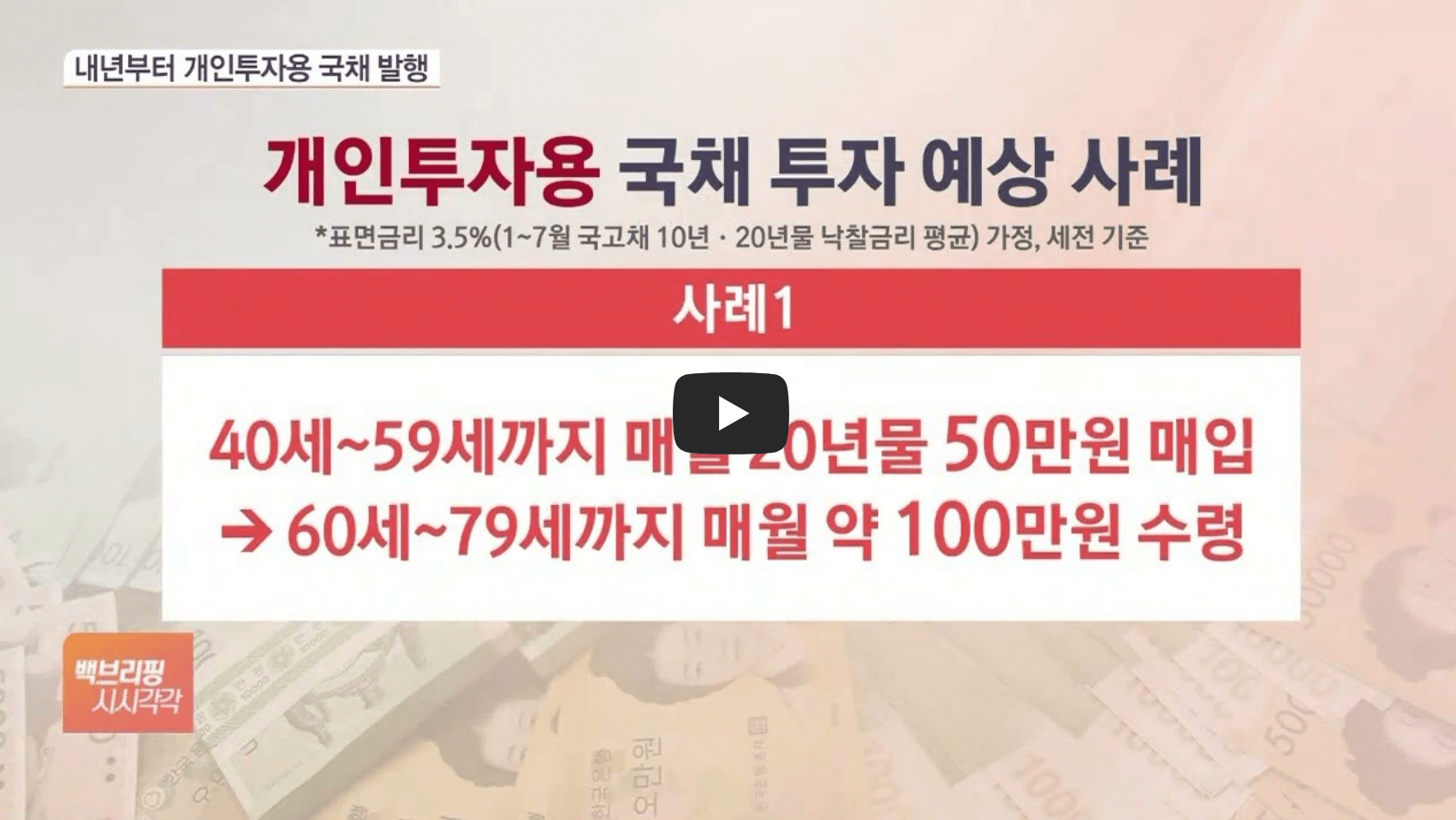 정부가 국민들의 장기 자산 형성을 돕기 위해 개인투자용 국채를 내년부터 도입하고 발행할 예정입니다. 개인투자용 국채는 20년 물로, 1억원을 매입하면 20년 후에 2억원을 수령할 수 있는 계산이 나옵니다. 어떤 내용인지, 어떤 투자 이득이 있을지 ▼아래 영상 또는 글을 통해 확인 가능합니다.