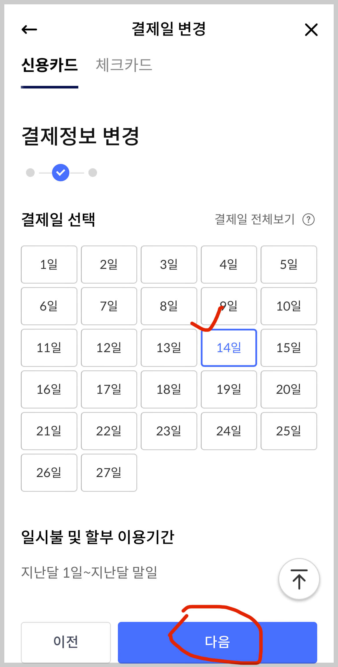 5. 결제일을 선택하시고 다음 버튼을 눌러 변경을 완료합니다.