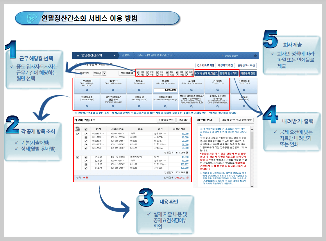 5. 간소화 자료 조회 후 PDF 다운로드 (또는 인쇄)하여 회사에 제출합니다.