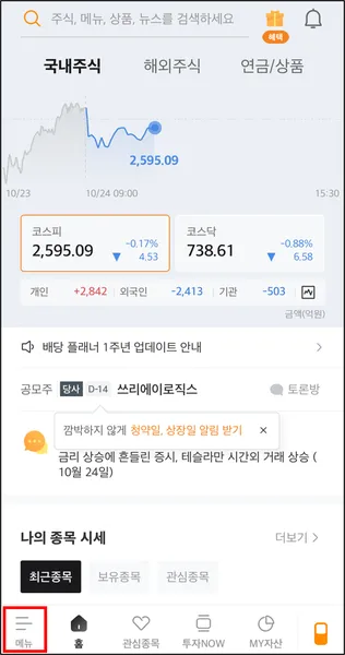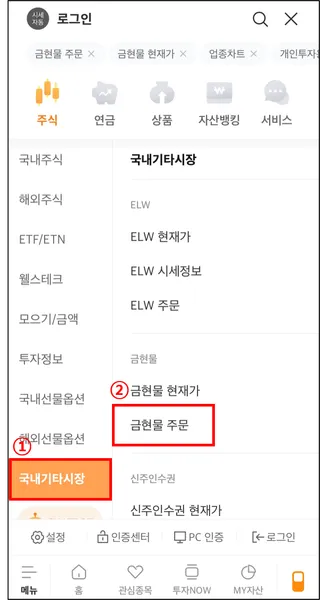 2. 홈 화면 하단에 세줄 메뉴 아이콘 선택 후 → 국내기타시장 → 금현물 주문 선택 순으로 선택합니다.